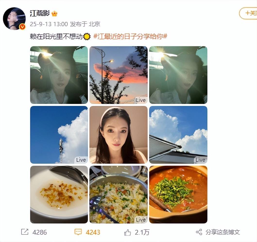 在9月13号这天,江疏影在社交平台发布了几组自拍,